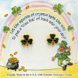 Our Shamrock Pin is layered in a 14Kt gold finish with six hand set faceted synthetic emerald stones. Each pin comes on a colorful Irish themed card with a “To and From” printed on the back so you can sign and address it, making it a great Gift or Gift card.