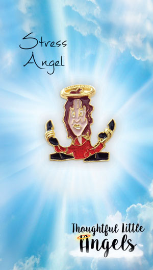 Our fun Stress Angel features a stressed out angel. The Angel is holding two phones and has a frazzled look on her face. The pin is layered in a 14Kt gold finish and is hand painted with epoxy. Each pin comes on a colorful greeting card that can be used as a gift card which has a thought provoking verse with a “To and From” on the back giving the ability to sign and address this special gift for that special someone.